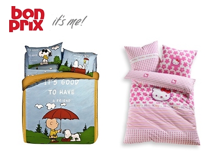 La teleria da letto di Bonprix è disponibile in tinta unita, double face, con personaggi come Snoopy, Hello Kitty oppure con fantasie floreali con colori vivaci e gradevoli che si possono abbinare facilmente ad ogni stile di arredamento.