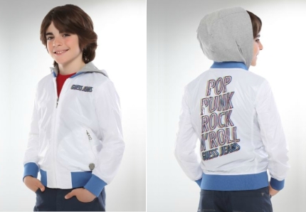 Questo giubbotto da bambino è dotato di chiusura e taschini frontali con cerniera lampo. Tra le altre caratteristiche troviamo cappuccio, balza, colletto e polsini di colore contrastante e dietro la bellissima stampa “Pop, Punk, Rock N’Roll” sul retro.