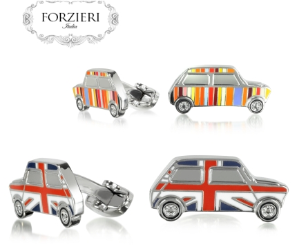 Sono disponibili i gemelli Paul Smith a forma di Mini nella fantasia multicolore oppure nella colorazione raffigurante la Union Jack, la bandiera inglese.