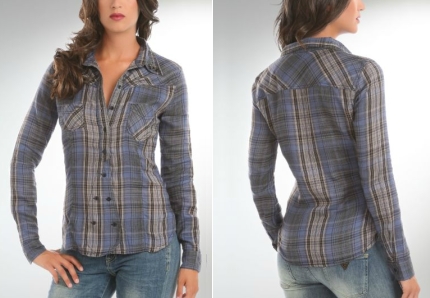 Si tratta di una camicia da donna a maniche lunghe con fantasia a scacchi con taschini ed abbottonatura asimmetrici davanti e pietre applicate sul colletto per un look molto moderno ed accattivante.
