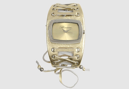 Questo bellissimo orologio da donna ha un particolare effetto laminato, le borchie con laccetti e cinturino in pelle. Movimento al quarzo per la massima precisione e cassa in acciaio inossidabile. La colorazione dorata dona un tocco di eleganza in più per le occasioni più esclusive.