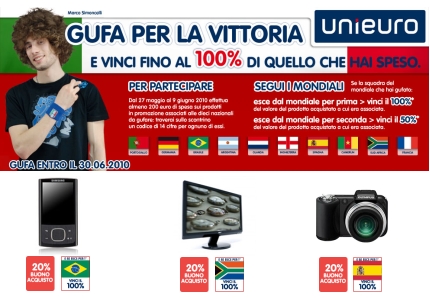Mancano ormai pochissimi giorni all’inizio dei Mondiali di calcio 2010 in Sud Africa e non mancano le promozioni soprattutto sull’acquisto di prodotti di elettronica. Unieuro lancia una divertentissima iniziativa:“Gufa per la vittoria” infatti permette di risparmiare il 50% del valore degli articoli in catalogo oppure venire totalmente rimborsati per l’intero valore di quello che si acquista.